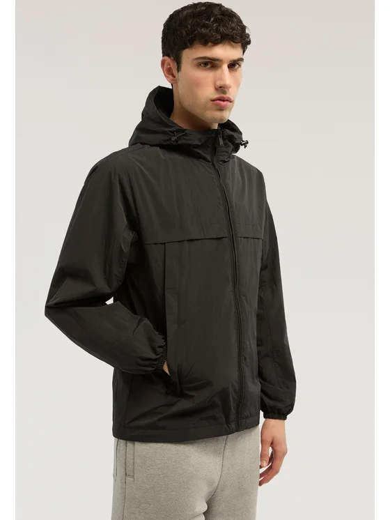 Realizzata in nylon crinkle con fodera; Giacca con cappuccio regolabile tramite coulisse; Tasche frontali con doppio ingresso e soffietto posteriore traspirante; Chiusura con zip frontale