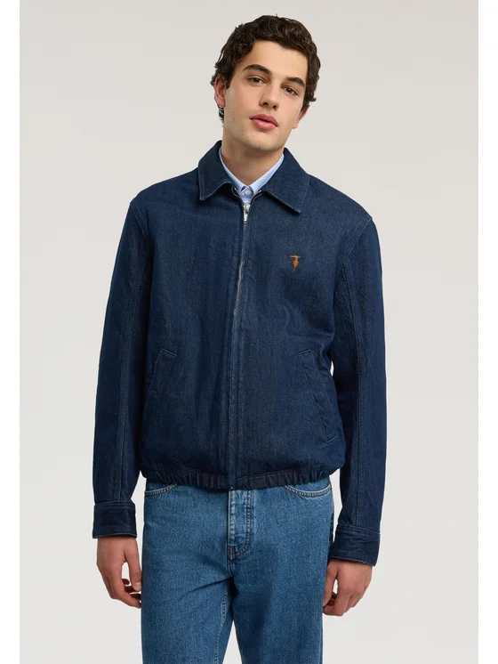 Realizzata in cotone denim blu rinse; Chiusura con zip e collo a camicia; Tasche laterali e ricamo levriero Trussardi in contrasto; Fodera in misto cotone