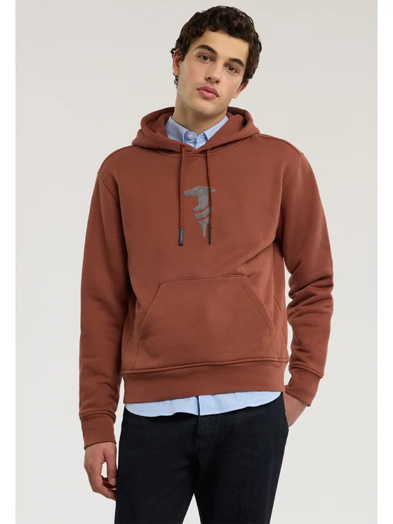 Realizzata in jersey diagonale di cotone; Felpa con cappuccio e stampa multirighe levriero Trussardi; Doppia tasca in nylon con bottone automatico