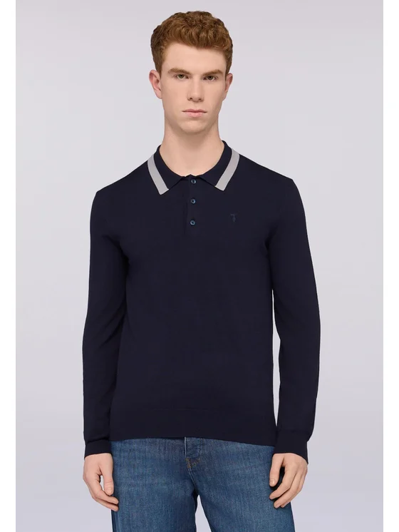 Viscosa rasata finezza 14; Chiusura con bottoni; Ricamo levriero Trussardi sul punto cuore e riga a contrasto sul colletto; Vestibilità regular
