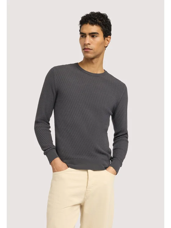 Cotone finezza 14 con lavorazione a punto tridimensionale; Girocollo con vestibilità regular; Etichetta Trussardi applicata sul fondo