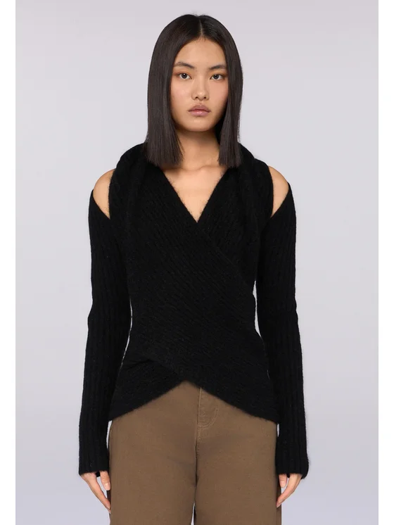Maglia in filato misto mohair e lana con lavorazione a coste; Spalle scoperte e scollo a V incrociato sul davanti; Collo alto avvolgente; Vestibilità slim