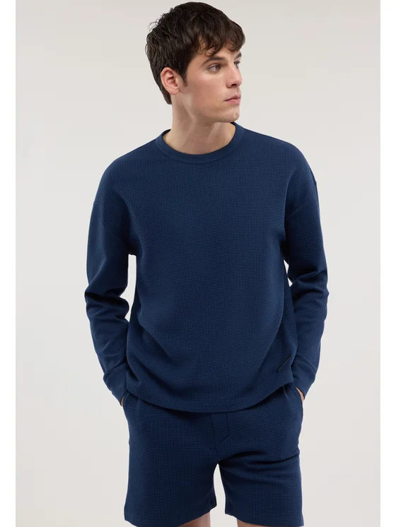 Realizzata in cotone; Girocollo in jersey leggero tridimensionale a nido d'ape; Dettaglio etichetta in pelle sul fondo; Vestibilità regular