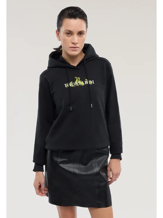 Realizzata in jersey diagonale misto cotone; Stampa e ricamo levriero Trussardi; Cappuccio con coulisse regolabile; Vestibilità regular fit