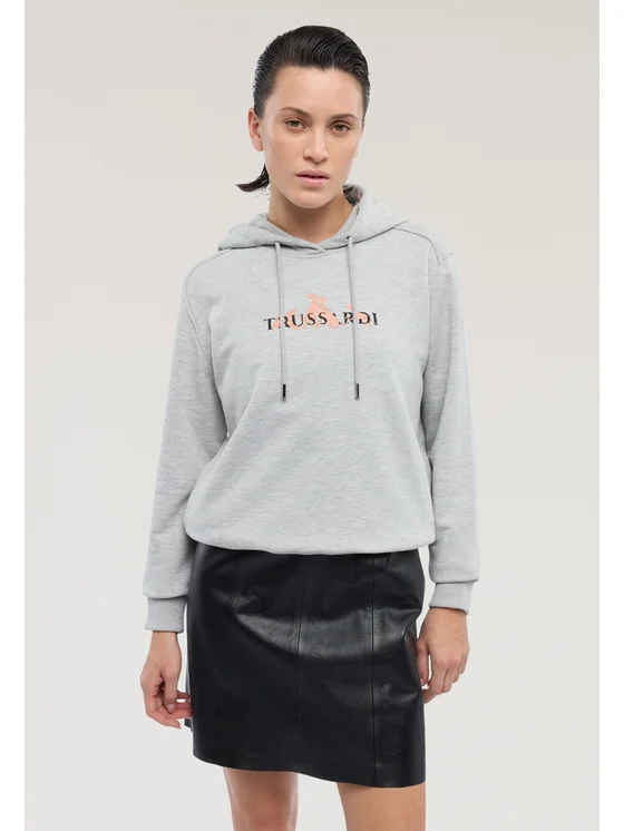 Realizzata in jersey diagonale misto cotone; Vestibilità regular fit con cappuccio; Stampa e ricamo levriero Trussardi; Cordini di regolazione
