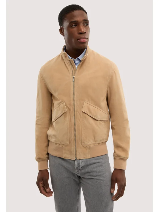 Realizzata in vera pelle suede; Modello sailor con chiusura zip frontale; Tasche applicate e fodera jacquard Gentle Society; Polsi e fondo a costina