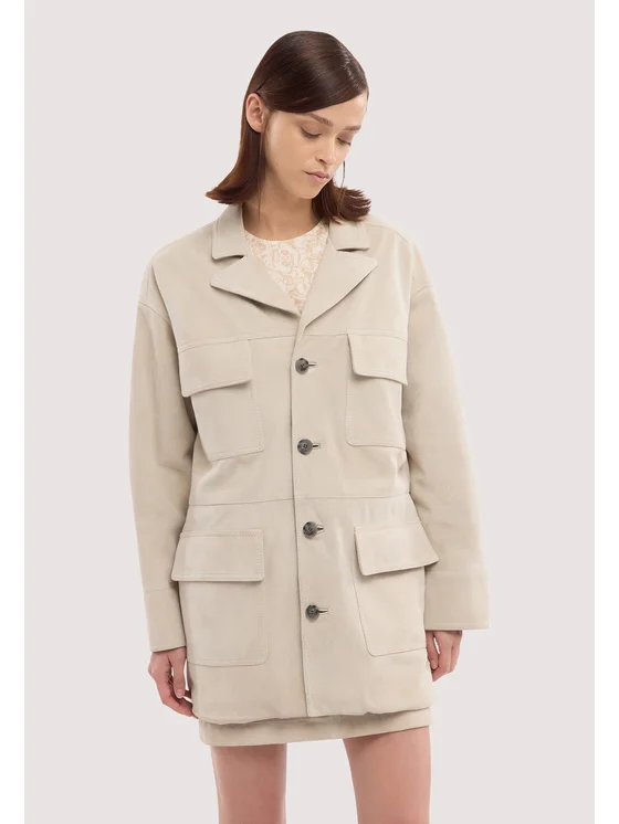 Realizzata in pelle scamosciata; Chiusura con bottoni; Quattro tasche frontali applicate; Fodera in viscosa