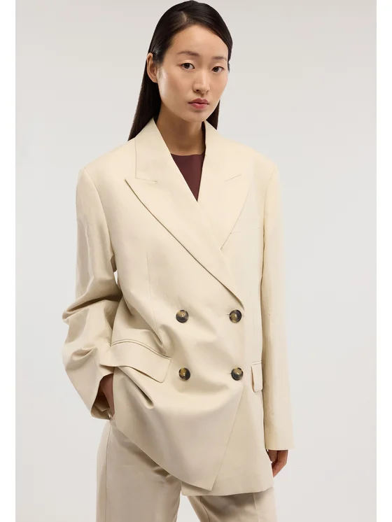 Realizzato in misto lino e cotone; Blazer doppiopetto con revers a lancia; Completamente foderato; Due tasche frontali