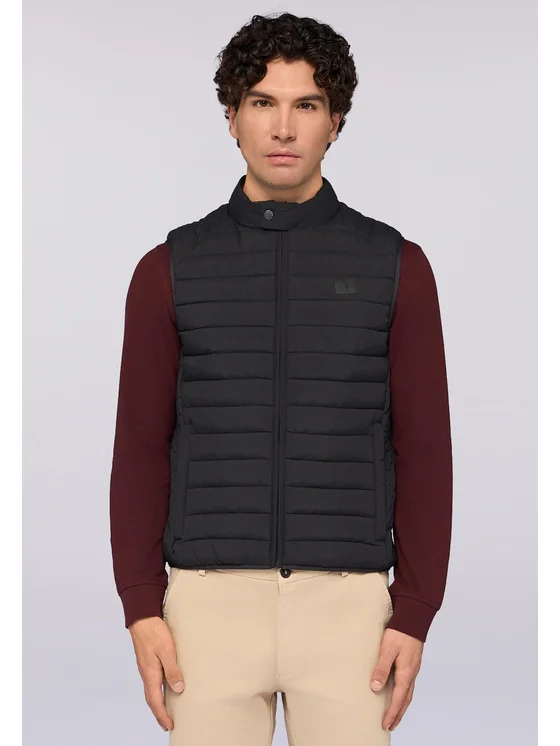 Realizzata in nylon crinkle idrorepellente; Giacca imbottita senza maniche; Portachiavi con levriero Trussardi nella tasca e tasca interna; Chiusura con zip frontale
