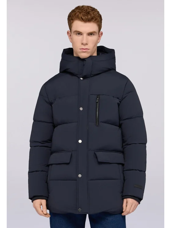 Realizzata in nylon laminato; Imbottitura in ovatta Sorona, cappuccio amovibile, bretelle interne staccabili; Tasche frontali con patta, tasca con zip sul punto cuore con piping a contrasto; Interno del collo in velluto millerighe