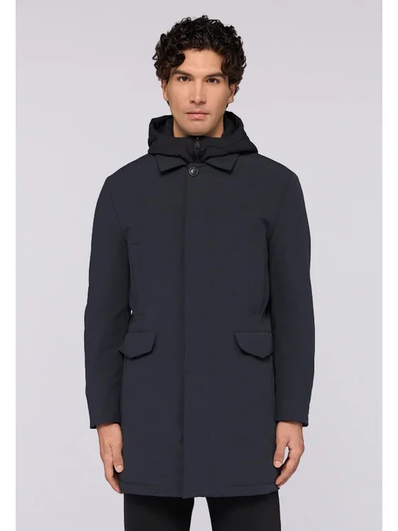 Realizzato in tessuto tech; Giacca imbottita con cappuccio amovibile; Doppia chiusura con zip e bottoni nascosti; Fodera interna Gentle Society.