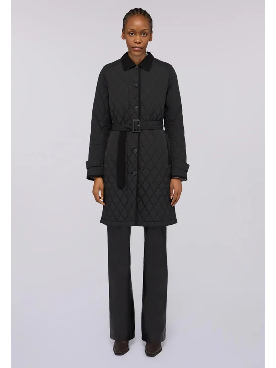 Realizzato in nylon opaco; Trapuntato con cintura e fibbia; Collo e dettagli in velluto; Chiusura con bottoni.