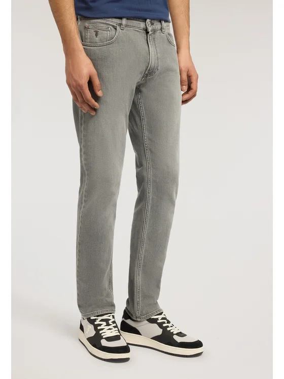 Denim in cotone con salpa in pelle e ricamo levriero Trussardi sul quinto taschino; 1% Elastan per maggiore comfort; Trattamento super stonewashed con ripasso chimico; Modello a tasche vestibilità regular
