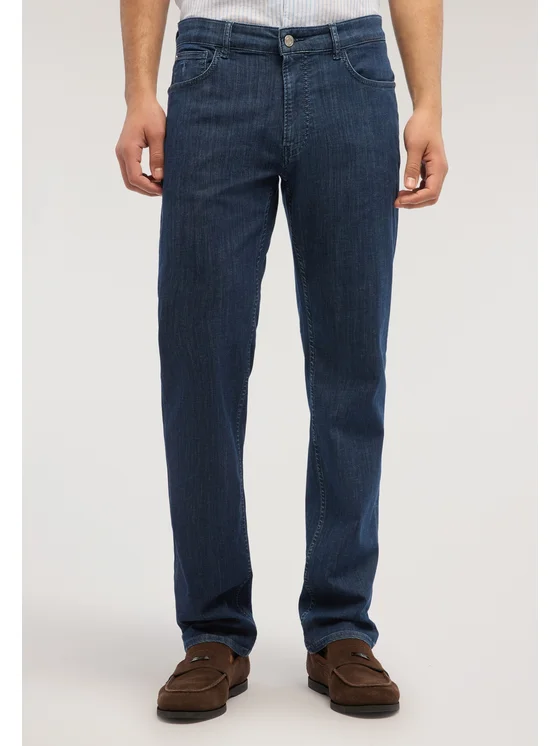 Denim con salpa in pelle e ricamo levriero Trussardi sul quinto taschino; 4% Elastan per maggiore comfort; Vestibilità Icon Regular 380