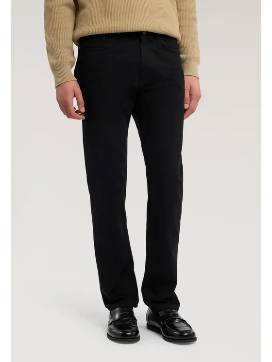 Denim con finiture in pelle e ricamo levriero Trussardi sulla quinta tasca; 4% di elastan per un maggiore comfort; Vestibilità Regular