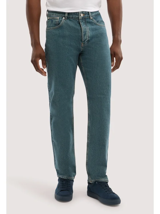 Denim con salpa in pelle e ricamo sul quinto taschino; Modello con chiusura a bottoni; Effetto vintage stonewashed; Vestibilità straight