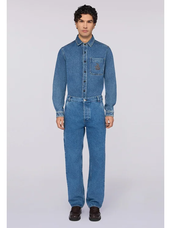 Denim stonewashed; Modello workwear con portamartello; Tasca laterale e tasche posteriori con etichetta Trussardi; Vestibilità dritta
