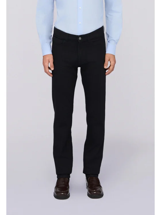 Denim nero rinse con salpa in pelle; 1% Elastan per maggiore comfort; Chiusura con zip e ricamo sul quinto taschino; Modello 370 Close Slim Fit