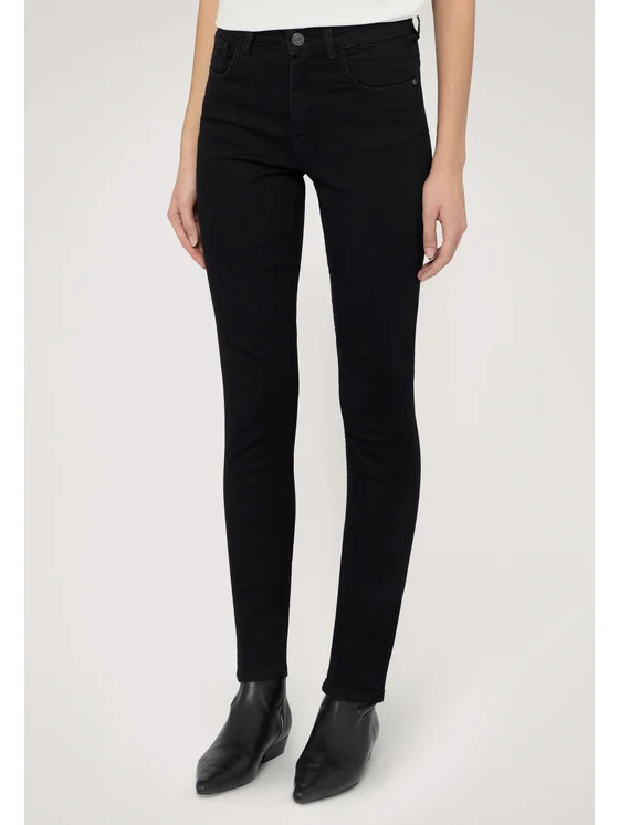 Jeans in denim nero rinse con salpa in pelle; 2% Elastan per maggiore comfort; Modello 5 tasche; Modello 105 Skinny