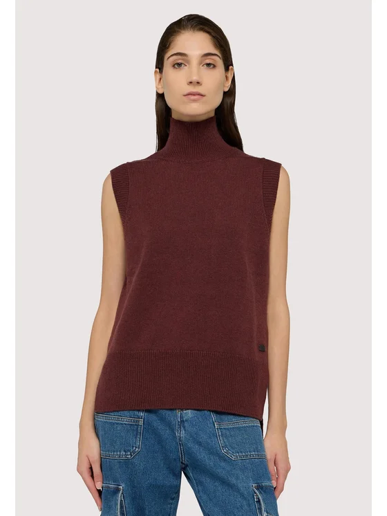 Maglia in filato misto lana finezza 7; Collo alto e senza maniche; Fit over per una vestibilità ampia; Logo applicato sul fondo