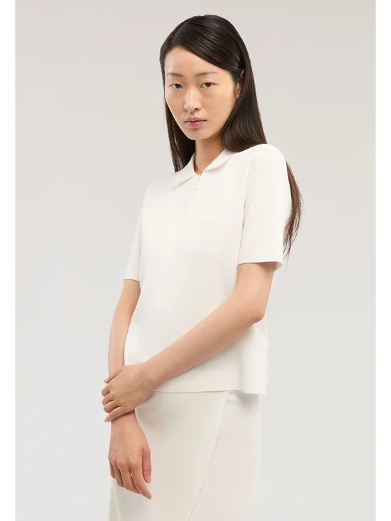 Maglia in filato misto viscosa punto milano; Modello crop con chiusura a zip; Taglio polo con colletto; Vestibilità regular