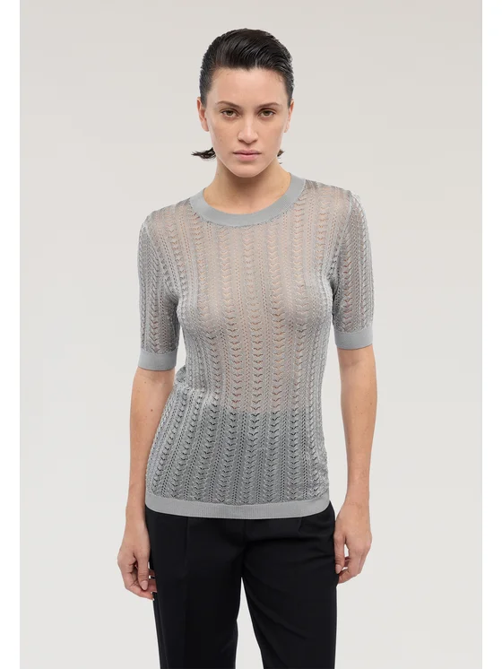 Maglia a manica corta con girocollo in filato misto viscosa con lavorazione a punto effetto pizzo; Dettagli traforati su tutto il capo; Vestibilità regular