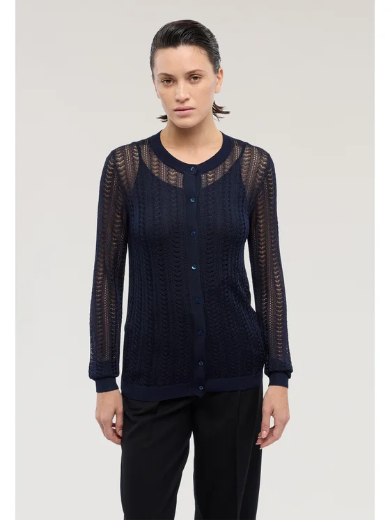 Lavorazione punto effetto pizzo; Chiusura frontale con bottoni; Scollo tondo; Vestibilità regular