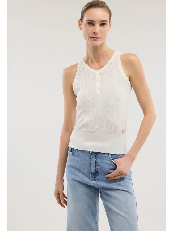 Realizzato in filato di cotone con lavorazione punto 3D; Abbottonatura a serafino frontale; Bordi a costina su scollo e giromanica; Vestibilità tank top senza maniche
