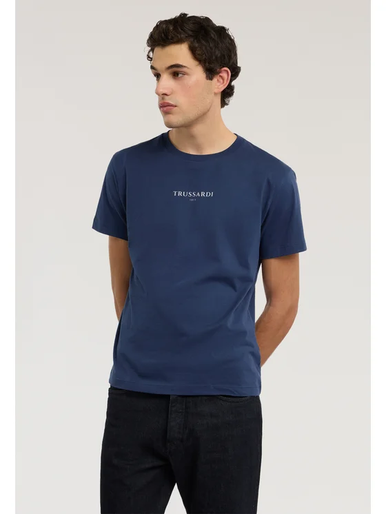 Jersey di cotone; Vestibilità regular fit; Girocollo e maniche corte; Stampa Trussardi in contrasto