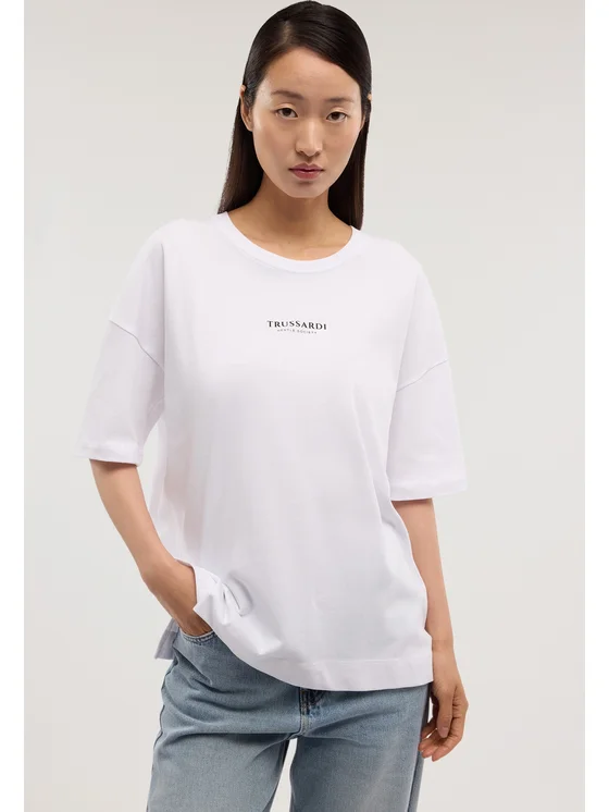 Jersey di cotone; Vestibilità over; Stampa Trussardi a contrasto; Girocollo e maniche corte