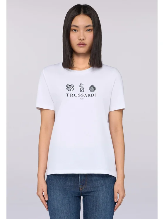 Jersey di cotone; Vestibilità regular fit; Stampa Legacy e ricamo Trussardi sul fronte; Girocollo e maniche corte
