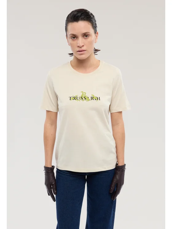 Jersey di cotone; Vestibilità regular fit; Stampa e ricamo levriero Trussardi; Girocollo